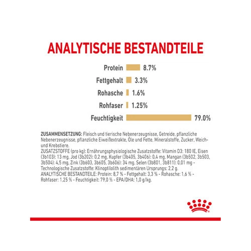 Royal Canin hat das Labrador Retriever Adult Law speziell für Labrador Retriever! Dieses köstliche Nassfutter bietet eine köstliche Vielfalt an Brocken. Royal Canin hat dieses Nahrungsmittel mit einem angepassten Kaloriengehalt hergestellt, um das Idealgewicht des Labradors zu erhalten. Darüber hinaus besteht das Futter zu 80% aus Wasser, wodurch sich der Hund schneller satt fühlt. Das speziell zusammengesetzte Futter ist mit Omega-3- und 6-Fettsäuren angereichert und sorgt für gesunde Gelenke und ein glänzendes Fell.