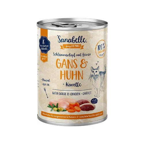 Sanabelle Schlemmertopf Adult mit Gans & Huhn mit Karotte + Olivenöl wird behutsam aus wertvollen und qualitativ hochwertigen Zutaten für Ihre ausgewachsene Katze zubereitet. Die zarten, saftigen Stückchen von der Gans und vom Huhn in delikater Soße bilden die Grundlage für eine ausgewachsene Ernährung und ein vitales Katzenleben.